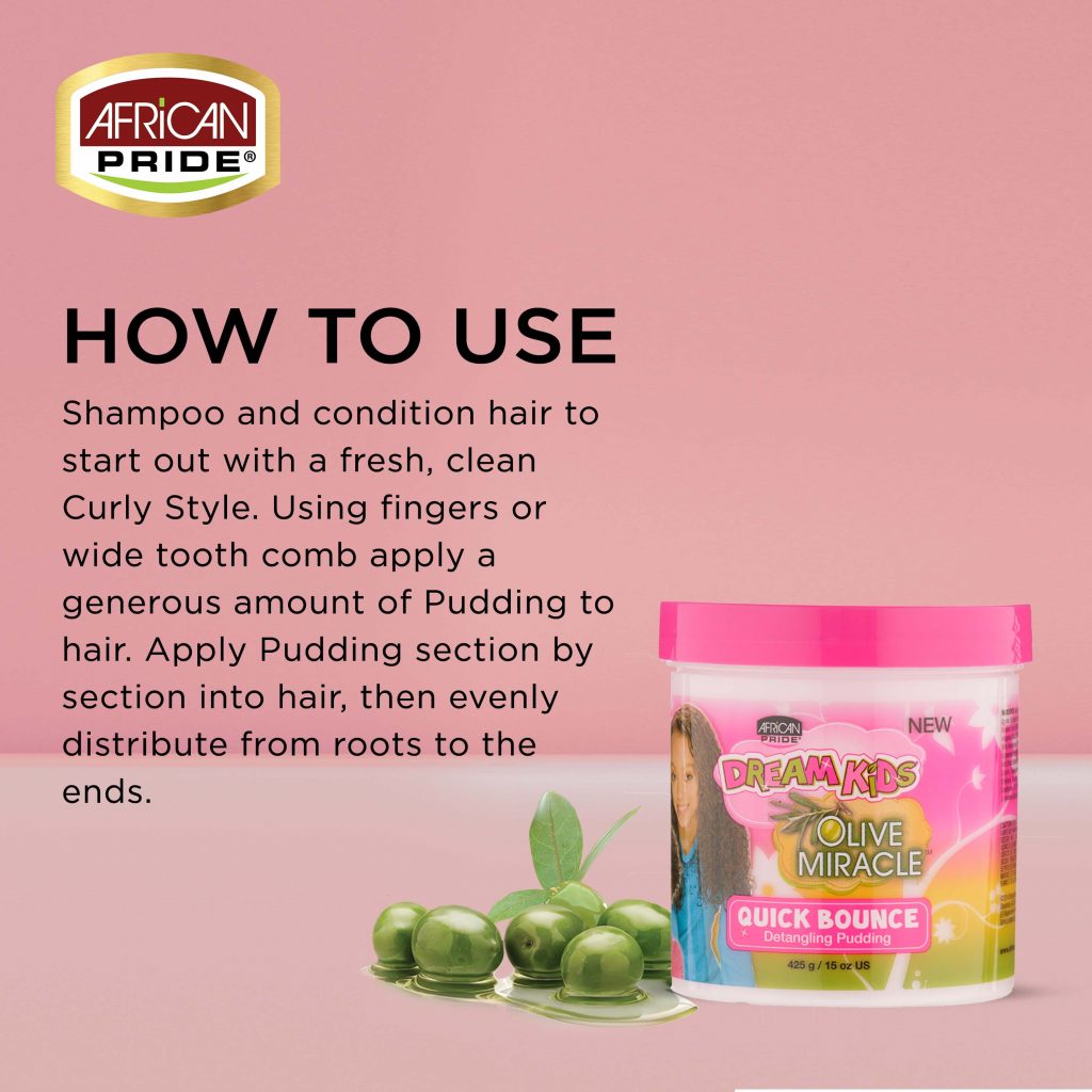 Our smooth, creamy, feather-light kids' formula contains the finest extra virgin olive oil and herbal extracts used for generations to help strengthen and protect hair. Formulated exclusively for children with delicate hair and scalps, Quick Bounce Detangling Pudding and its intense moisturizing properties help manage tangles, instantly improve softness, and boost shine in naturally curly, wavy, kinky-coily hair.